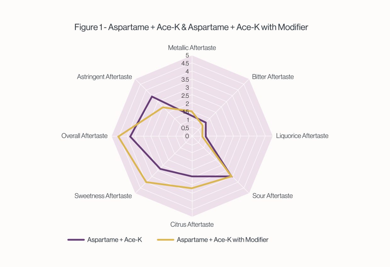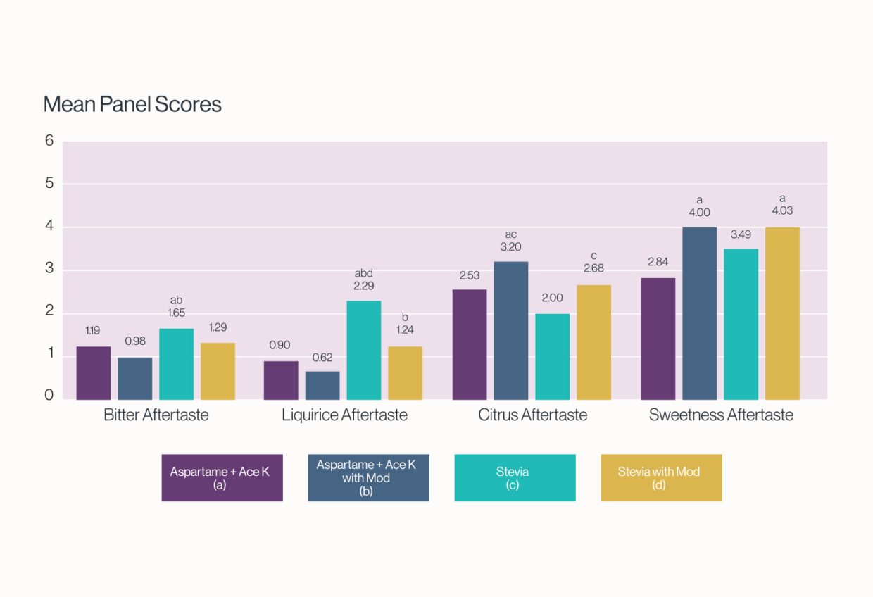 The Aspartame + Ace-K with the TM2 FMP (Modifier) scored significantly higher than the Aspartame + Ace-K product for Citrus Aftertaste, Sweetness Aftertaste and Overall Aftertaste.